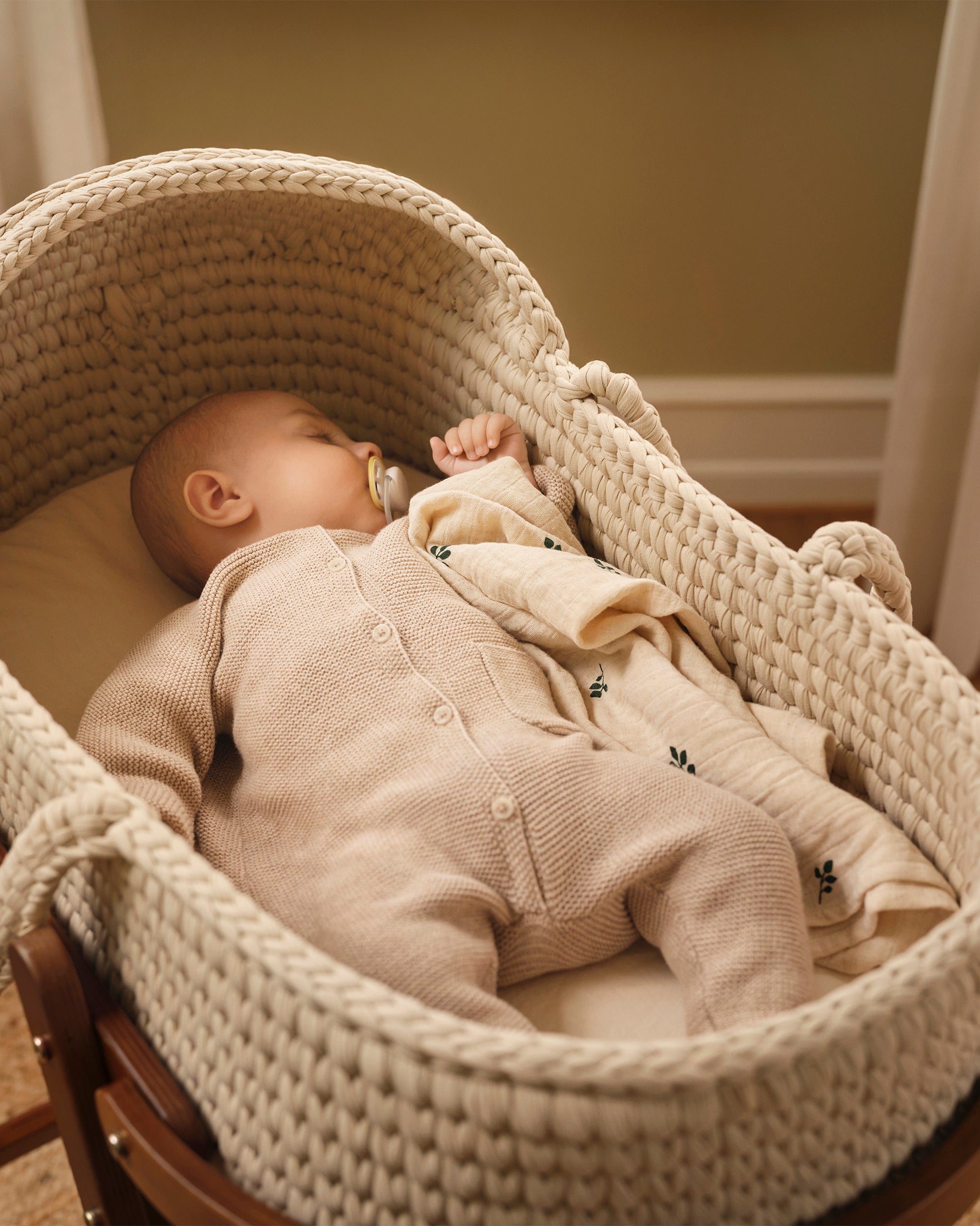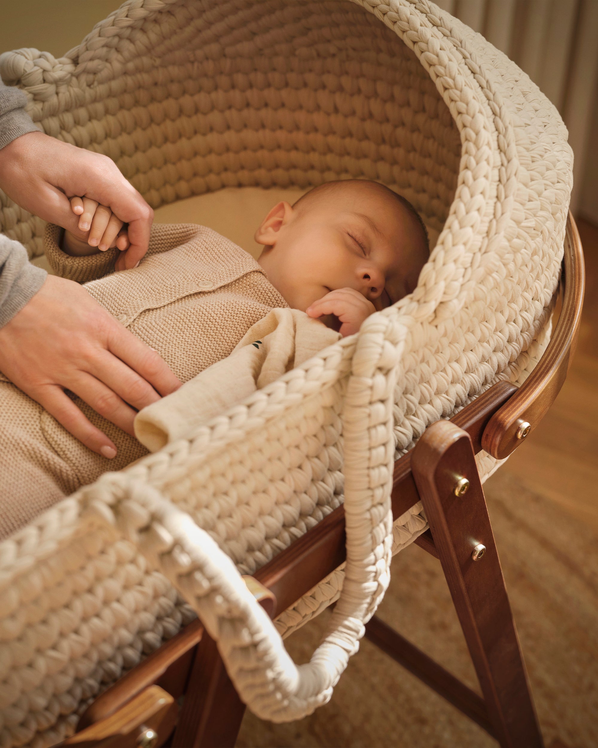 Crafted with Scandinavian design in mind, our handmade moses basket combines practicality with timeless style. The handwoven basket and wooden stand work together to create a firm, flat, and familiar space for your newborn. The fixed hood and the stand’s gentle rocking motion come together to create a calmer, more protected resting space that helps soothe your baby to sleep.