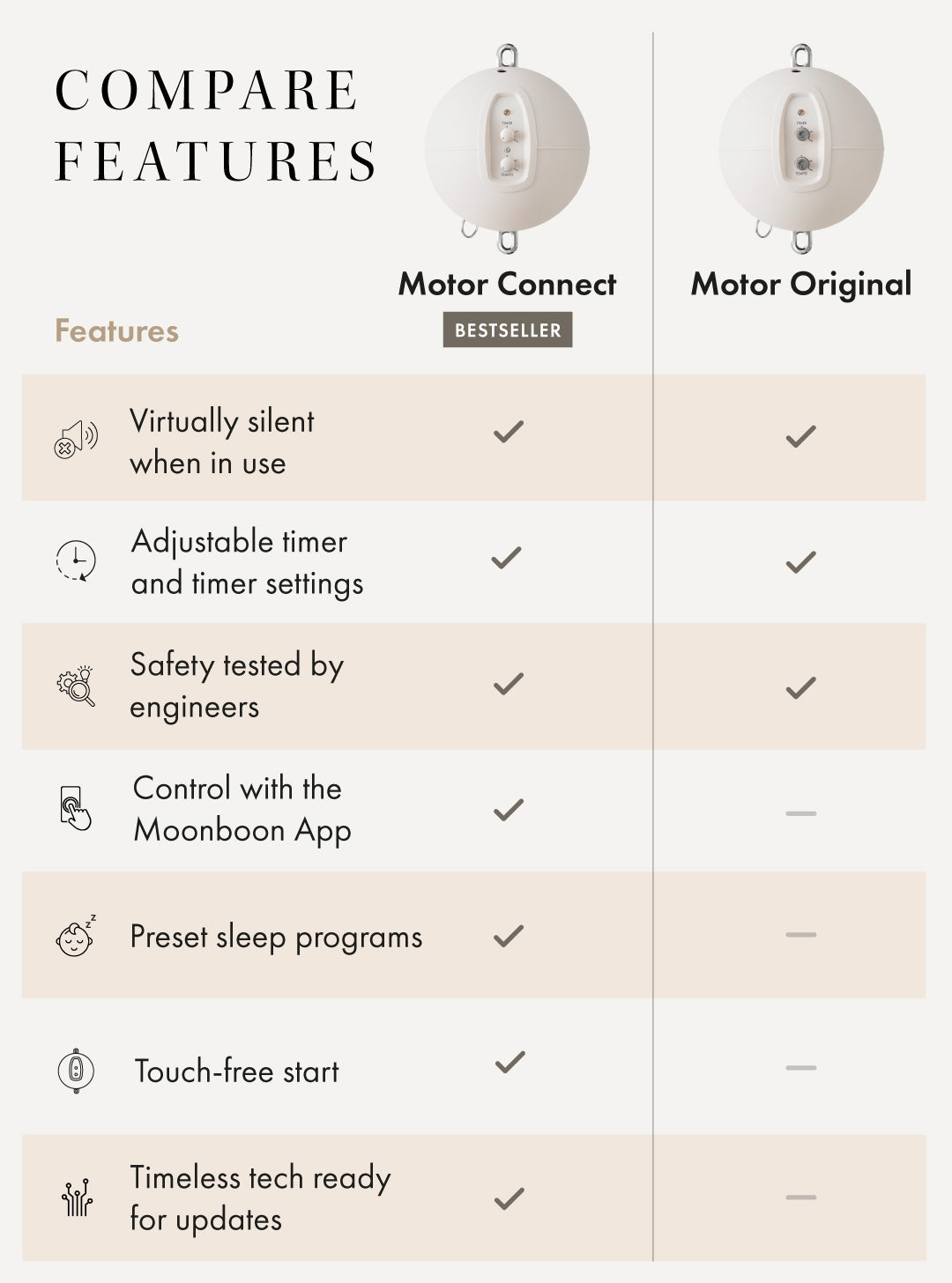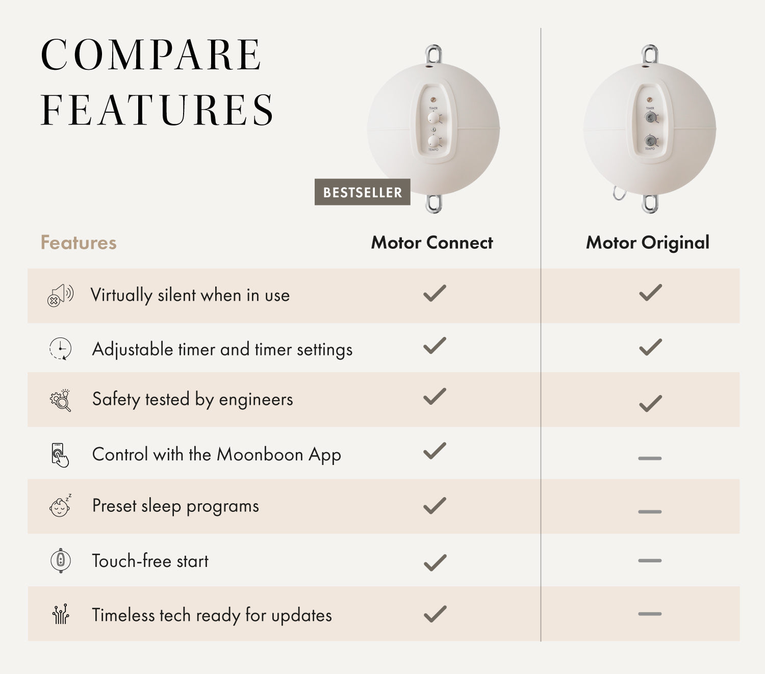 The combination of our spacious, flat-based cradle with one of our quiet motors is a match made in dreamland. You have the choice between our Motor Original or our app-conrolled Motor Connect. They create a calm and blissful sleeping habitat combined with gentle rocking to suit your baby’s own needs and give them comforting memories of being inside the womb.