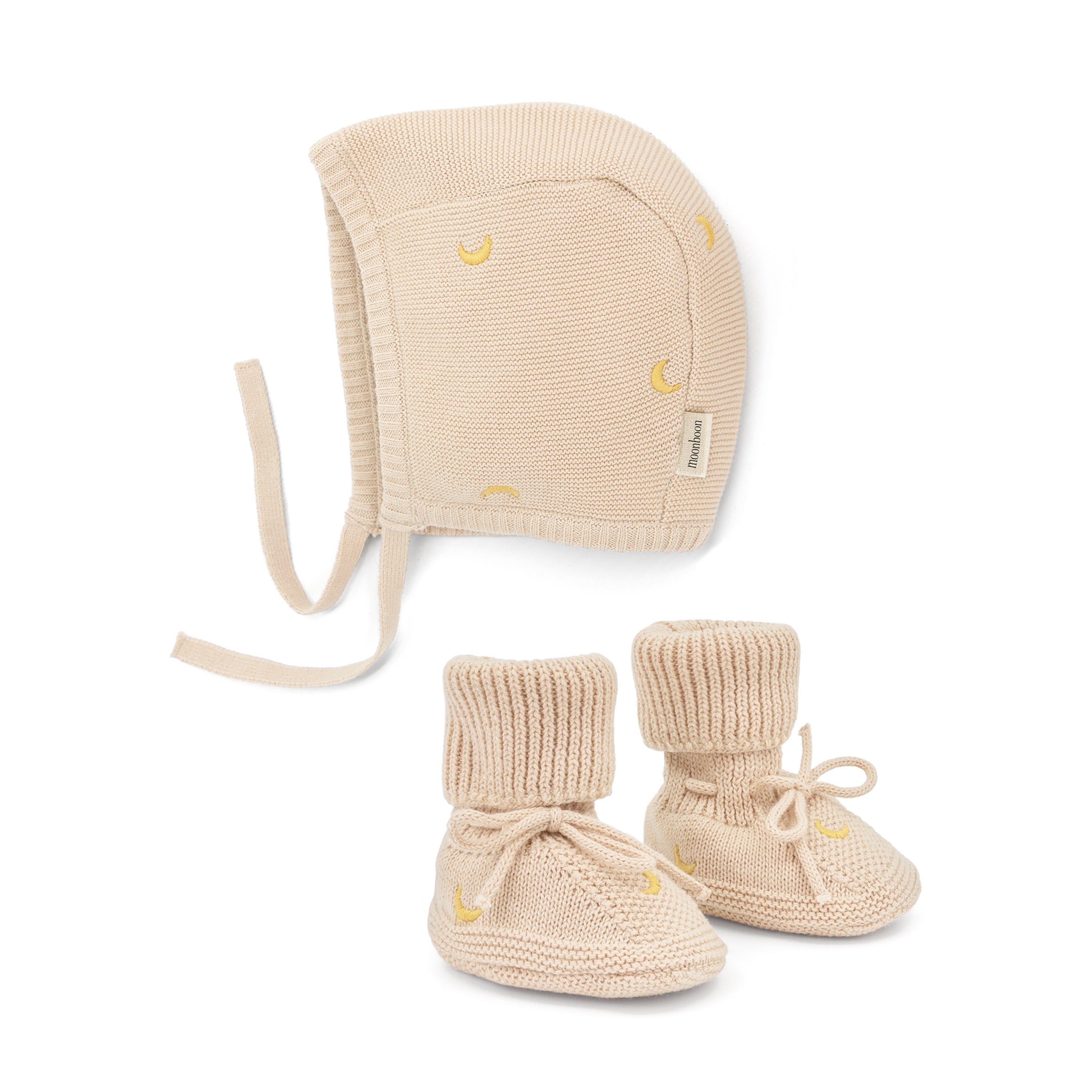 Welcome a new baby to the world with this sweet gift set, featuring a cozy knitted bonnet and matching soft booties.